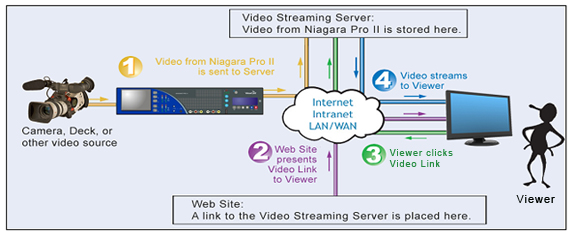 The conversion process is the careful balance of several factors, including acceptable video quality, available network bandwidth, desired playback picture size and playback device capabilities. The device doing the compressing is called the Encoder, and in the figure below, the Encoder is shown as one of our ViewCast Niagara models - the Niagara Pro II. The Encoder accepts live video and audio and compresses them into a stream of data, delivered continuously by the Encoder’s TCP/IP network port.